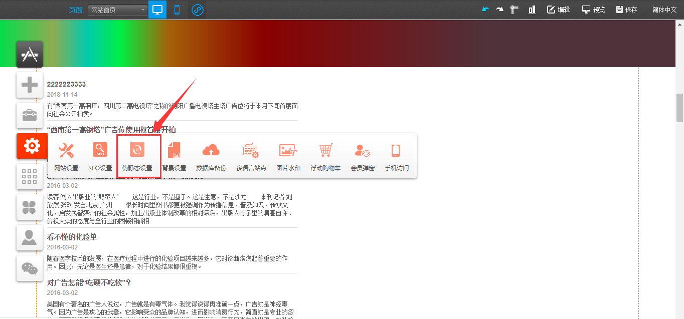 1.以PC版为例,首先在建站编辑器中点击“设置”-“伪静态”-“添加伪静态规则”,选择页面的类型“产品列表”或“文章列表”,进行伪静态的设置,设置完成后点击“保存”,然后在编辑器中拖入“文章分类”或“产品分类”,点击“设置”,将分类链接页面与在伪静态设置中的页面选择一致即可,然后点击保存,如图所示: